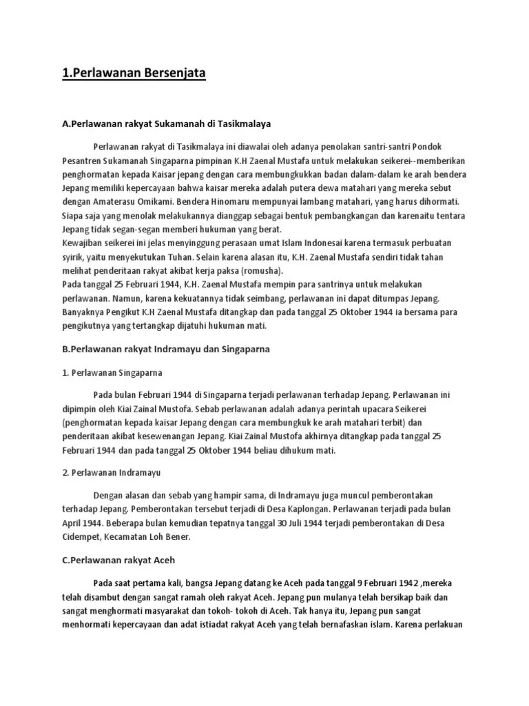 Hal ini menyebabkan pertempuran pecah di perusahaan kayu. Masa penjajahan pemerintah jepang di indonesia jika dibandingkan dengan pemerintah kolonial belanda memang jauh lebih singkat. perlawanan rakyat singapura dipimpin oleh k.h zainal mustafa, seorang pimpinan pesantren sukammah di singaparna, tasikmalaya (jawa barat). Peristiwa cot plieng, aceh 10 november 1942. perlawanan ini dipimpin oleh kiai zainal mustofa.